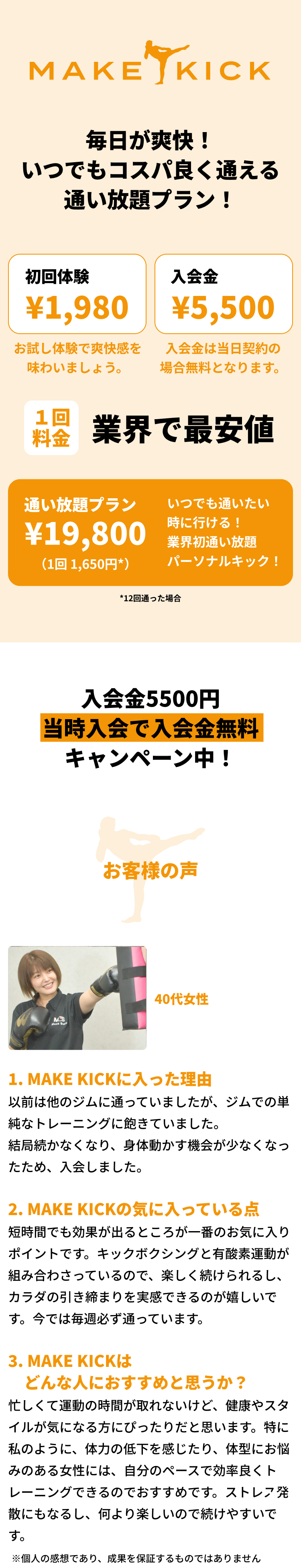 MAKE KICKのプログラムは基本のトレーニングから始めるので初心者にもお気軽に挑戦していただけます!段々と上達していく達成感をぜひ体験してみてください!ミット打ちはストレス発散だけでなく高い脂肪燃焼があります!運動の楽しさを一緒に実感しましょう!